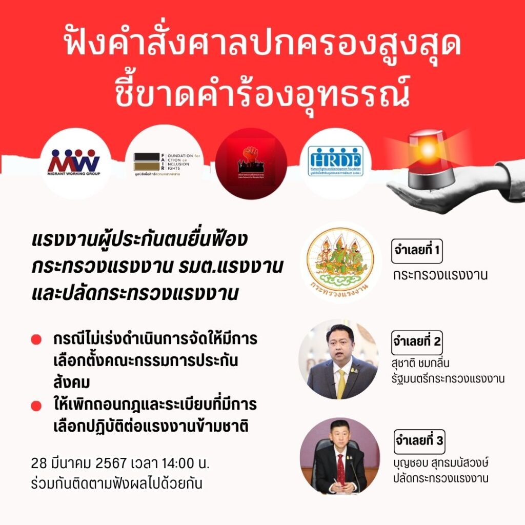 ร่วมรับฟังและติดตามคำสั่งศาลปกครอง ชี้ขาดคำร้องอุทธรณ์ แรงงานผู้ประกันตน ยื่นฟ้อง รัฐมนตรีว่าการกระทรวงแรงงาน กระทรวงแรงงานและปลัดกระทรวงแรงงาน กรณีไม่เร่งดำเนินการจัดให้มีการเลือกตั้งคณะกรรมการประกันสังคม และให้เพิกถอนกฎและระเบียบที่มีการเลือกปฏิบัติต่อแรงงานข้ามชาติ