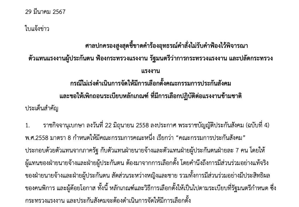 ศาลปกครองสูงสุดชี้ขาดคำร้องอุทธรณ์คำสั่งไม่รับคำฟ้องไว้พิจารณา ตัวแทนแรงงานผู้ประกันตน ฟ้องกระทรวงแรงงาน รัฐมนตรีว่าการกระทรวงแรงงาน และปลัดกระทรวงแรงงาน กรณีไม่เร่งดำเนินการจัดให้มีการเลือกตั้งคณะกรรมการประกันสังคม และขอให้เพิกถอนระเบียบหลักเกณฑ์ ที่มีการเลือกปฏิบัติต่อแรงงานข้ามชาติ