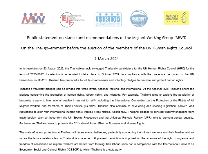 Public statement on stance and recommendations of the Migrant Working Group (MWG) On the Thai government before the election of the members of UN Human Rights Council
