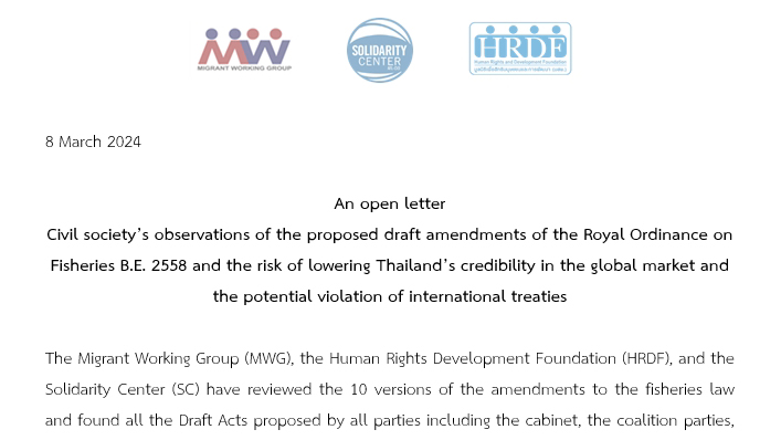 An open letter: Civil society’s observations of the proposed draft amendments of the Royal Ordinance on Fisheries B.E. 2558 and the risk of lowering Thailand’s credibility in the global market and the potential violation of international treaties