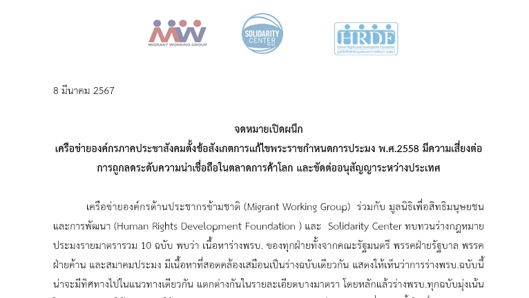 จดหมายเปิดผนึก: เครือข่ายองค์กรภาคประชาสังคมตั้งข้อสังเกตการแก้ไขพระราชกำหนดการประมง พ.ศ.2558 มีความเสี่ยงต่อการถูกลดระดับความน่าเชื่อถือในตลาดการค้าโลก และขัดต่ออนุสัญญาระหว่างประเทศ