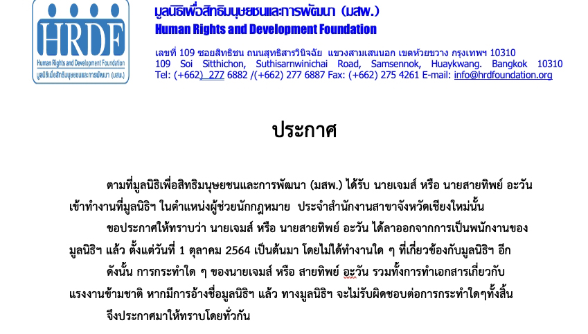 ประกาศ: นายเจมส์ หรือ นายสายทิพย์ อะวัน ได้ลาออกจากการเป็นพนักงานของมูลนิธิฯ แล้ว ตั้งแต่วันที่ 1 ตุลาคม 2564 เป็นต้นมา โดยไม่ได้ทำงานใด ๆ ที่เกี่ยวข้องกับมูลนิธิฯ อีก