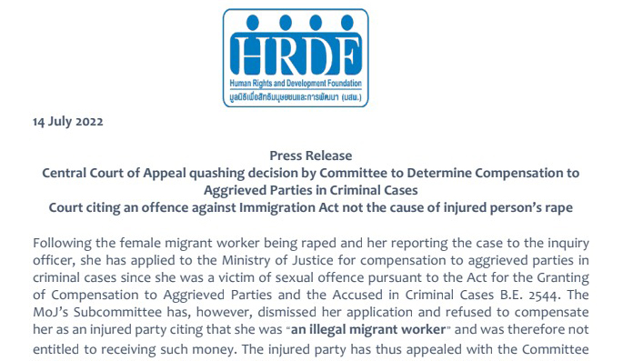 Press Release: Central Court of Appeal quashing decision by Committee to Determine Compensation to Aggrieved Parties in Criminal Cases Court citing an offence against Immigration Act not the cause of injured person’s rape