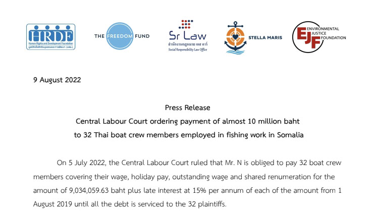 Press Release: Central Labour Court ordering payment of almost 10 million baht to 32 Thai boat crew members employed in fishing work in Somalia