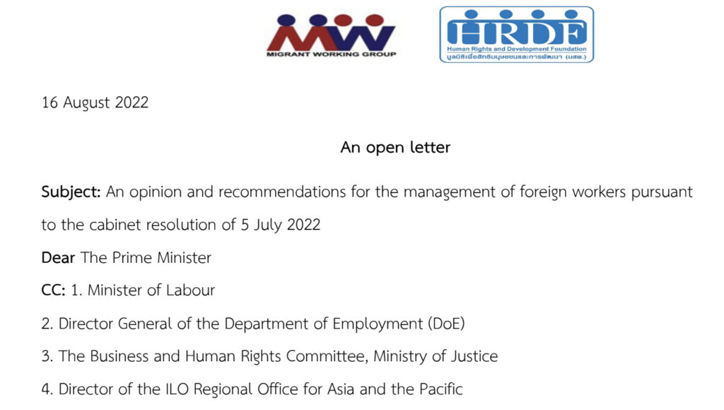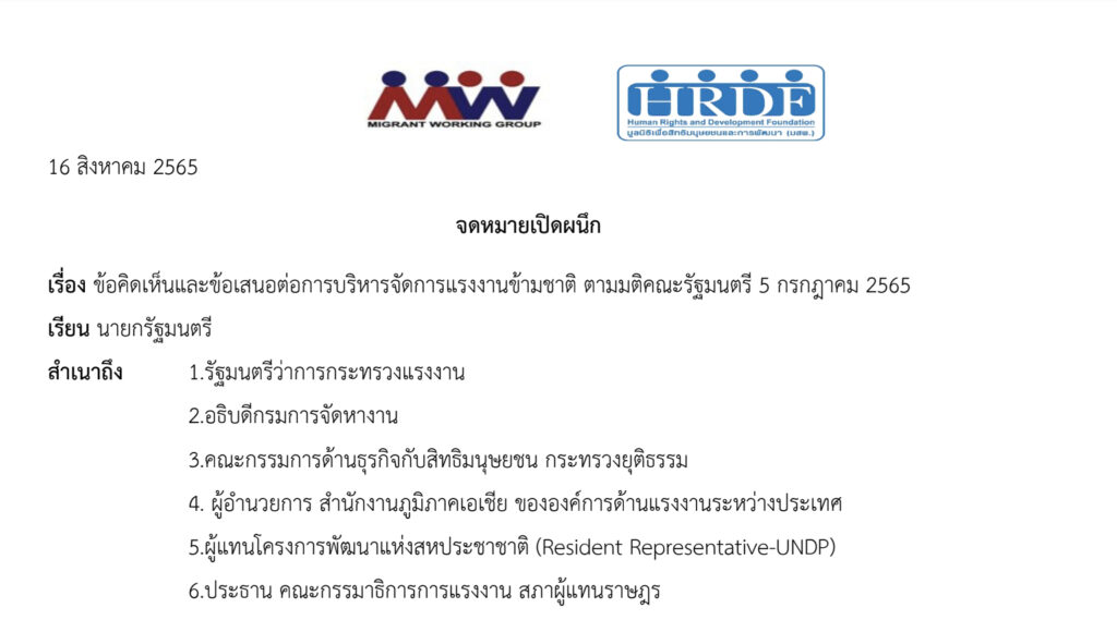 จดหมายเปิดผนึก เรื่อง ข้อคิดเห็นและข้อเสนอต่อการบริหารจัดการแรงงานข้ามชาติ ตามมติคณะรัฐมนตรี 5 กรกฎาคม 2565