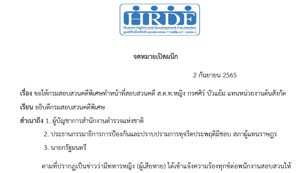 จดหมายเปิดผนึก: ขอให้กรมสอบสวนคดีพิเศษทำหน้าที่สอบสวนคดี ส.ต.ท.หญิง กรศศิร์ บัวแย้ม แทนหน่วยงานต้นสังกัด