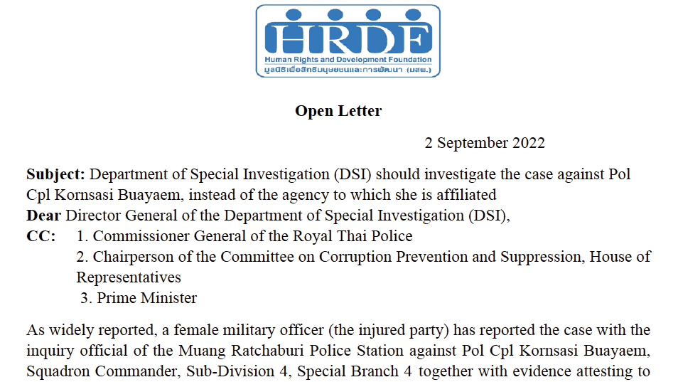 Open Letter: Department of Special Investigation (DSI) should investigate the case against Pol Cpl Kornsasi Buayaem, instead of the agency to which she is affiliated