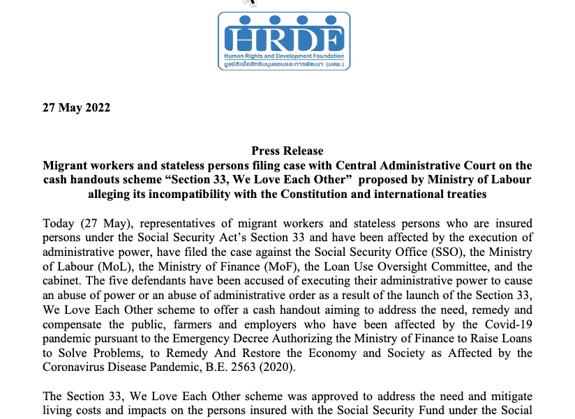 Press Release: Migrant workers and stateless persons filing case with Central Administrative Court on the cash handouts scheme “Section 33, We Love Each Other” proposed by Ministry of Labour alleging its incompatibility with the Constitution and international treaties