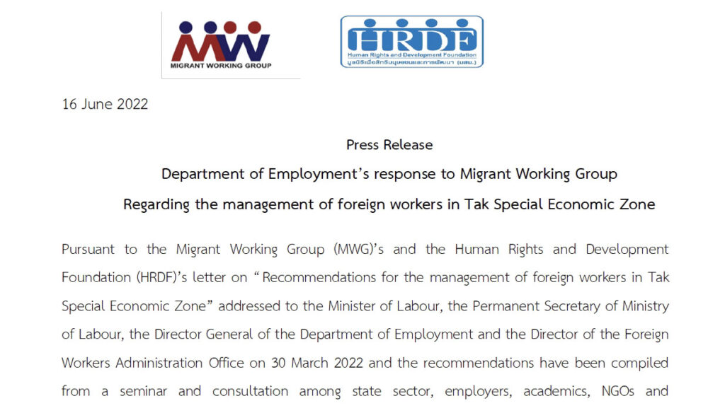 Press Release: Department of Employment’s response to Migrant Working Group Regarding the management of foreign workers in Tak Special Economic Zone