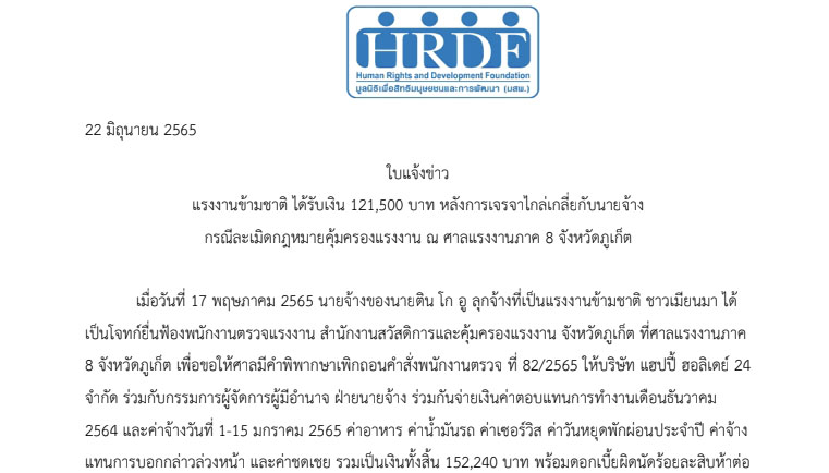 ใบแจ้งข่าว: แรงงานข้ามชาติ ได้รับเงิน 121,500 บาท หลังการเจรจาไกล่เกลี่ยกับนายจ้าง กรณีละเมิดกฎหมายคุ้มครองแรงงาน ณ ศาลแรงงานภาค 8 จังหวัดภูเก็ต