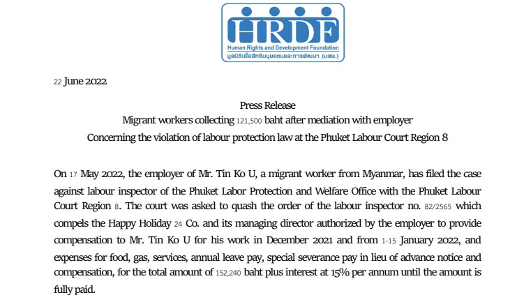 Press Release : Migrant workers collecting 121,500 baht after mediation with employer Concerning the violation of labour protection law at the Phuket Labour Court Region 8