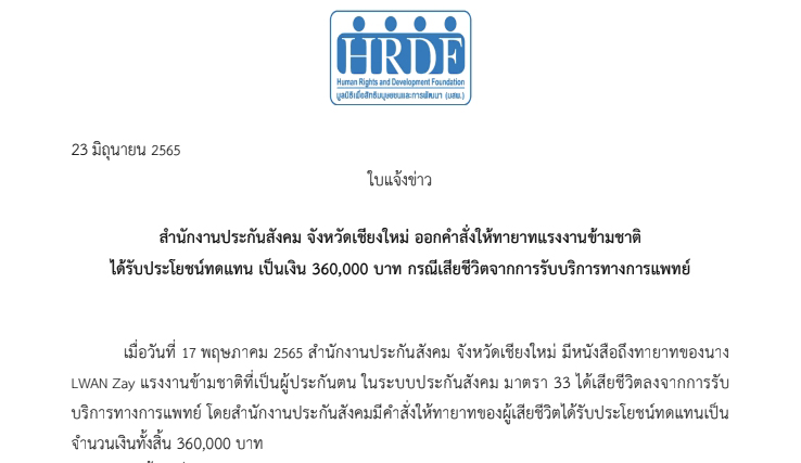 ใบแจ้งข่าว: สำนักงานประกันสังคม จังหวัดเชียงใหม่ ออกคำสั่งให้ทายาทแรงงานข้ามชาติ ได้รับประโยชน์ทดแทน เป็นเงิน 360,000 บาท กรณีเสียชีวิตจากการรับบริการทางการแพทย์