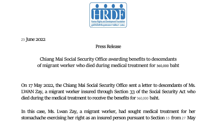 Press Release: Chiang Mai Social Security Office awarding benefits to descendants of migrant worker who died during medical treatment for 360,000 baht