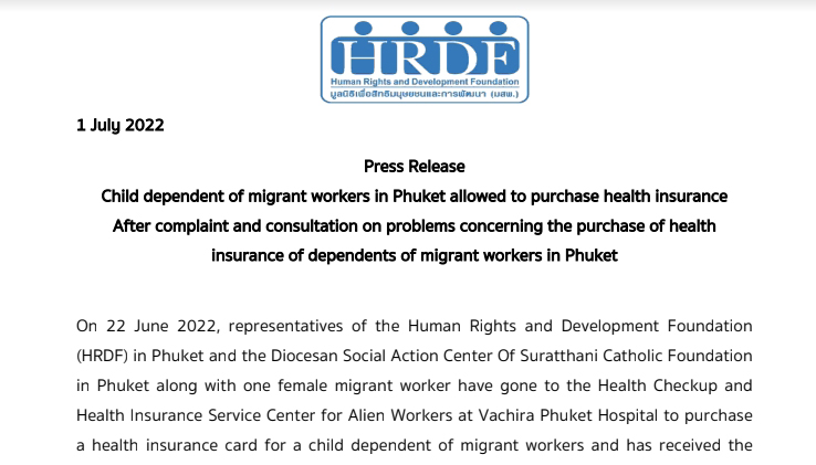 Press Release: Child dependent of migrant workers in Phuket allowed to purchase health insurance After complaint and consultation on problems concerning the purchase of health insurance of dependents of migrant workers in Phuket