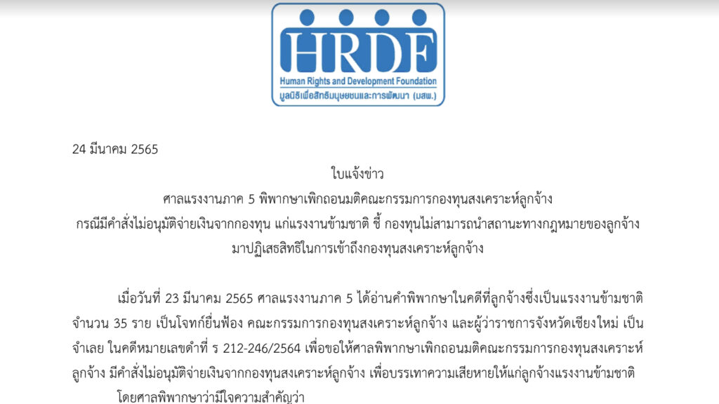 ใบแจ้งข่าว: ศาลแรงงานภาค 5 พิพากษาเพิกถอนมติคณะกรรมการกองทุนสงเคราะห์ลูกจ้าง กรณีมีคำสั่งไม่อนุมัติจ่ายเงินจากกองทุน แก่แรงงานข้ามชาติ ชี้ กองทุนไม่สามารถนำสถานะทางกฎหมายของลูกจ้างมาปฏิเสธสิทธิในการเข้าถึงกองทุนสงเคราะห์ลูกจ้าง