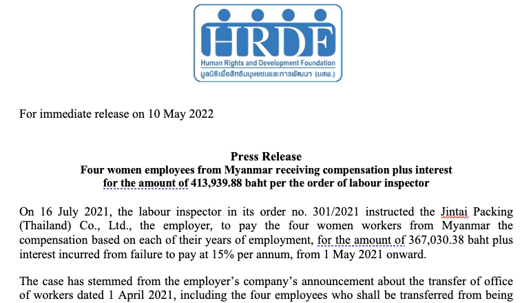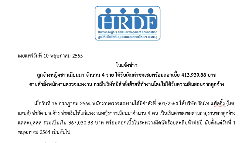 ใบแจ้งข่าว: ลูกจ้างหญิงชาวเมียนมาจำนวน 4 ราย ได้รับเงินค่าชดเชยพร้อมดอกเบี้ย 413,939.88 บาท ตามคำสั่งพนักงานตรวจแรงงาน กรณีบริษัทมีคำสั่งย้ายที่ทำงานโดยไม่ได้รับความยินยอมจากลูกจ้าง