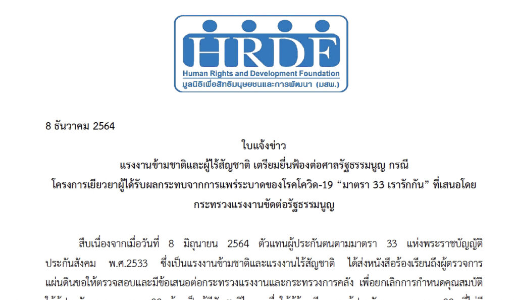ใบแจ้งข่าว: แรงงานข้ามชาติและผู้ไร้สัญชาติ เตรียมยื่นฟ้องต่อศาลรัฐธรรมนูญ กรณี โครงการเยียวยาผู้ได้รับผลกระทบจากการแพร่ระบาดของโรคโควิด-19 “มาตรา 33 เรารักกัน” ที่เสนอโดยกระทรวงแรงงานขัดต่อรัฐธรรมนูญ