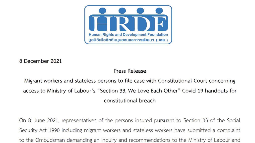 Press Release: Migrant workers and stateless persons to file case with Constitutional Court concerning access to Ministry of Labour’s “Section 33, We Love Each Other” Covid-19 handouts for constitutional breach