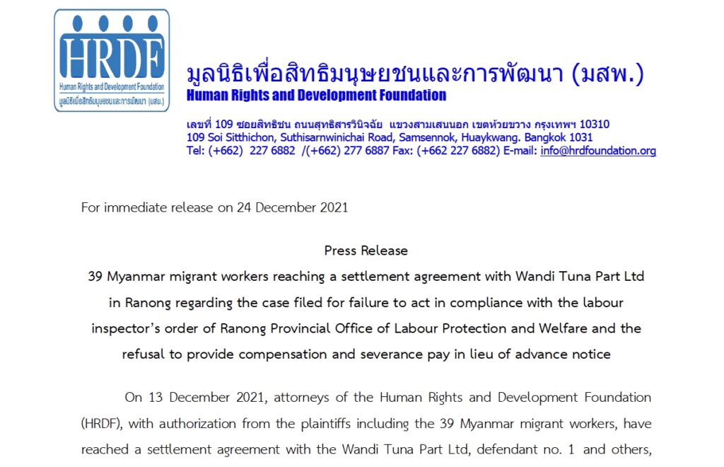 Press Release: 39 Myanmar migrant workers reaching a settlement agreement with Wandi Tuna Part Ltd in Ranong regarding the case filed for failure to act in compliance with the labour inspector’s order of Ranong Provincial Office of Labour Protection and Welfare and the refusal to provide compensation and severance pay in lieu of advance notice