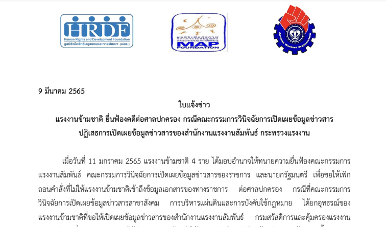 ใบแจ้งข่าว: แรงงานข้ามชาติ ยื่นฟ้องคดีต่อศาลปกครอง กรณีคณะกรรมการวินิจฉัยการเปิดเผยข้อมูลข่าวสาร ปฏิเสธการเปิดเผยข้อมูลข่าวสารของสำนักงานแรงงานสัมพันธ์ กระทรวงแรงงาน