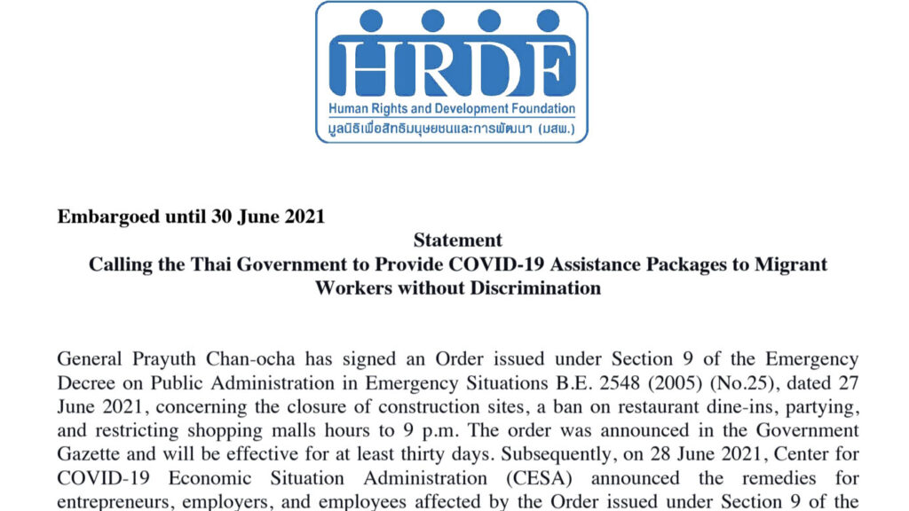 แถลงการณ์: เรียกร้องให้รัฐบาลเยียวยาแรงงานข้ามชาติที่ได้รับผลกระทบจากการแพร่ระบาดของโรคโควิด 19 โดยไม่เลือกปฏิบัติ
