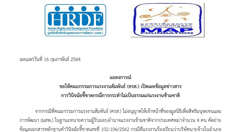 แถลงการณ์: ขอให้คณะกรรมการแรงงานสัมพันธ์ (ครส.) เปิดเผยข้อมูลข่าวสาร การวินิจฉัยชี้ขาดกรณีการกระทำไม่เป็นธรรมแก่แรงงานข้ามชาติ