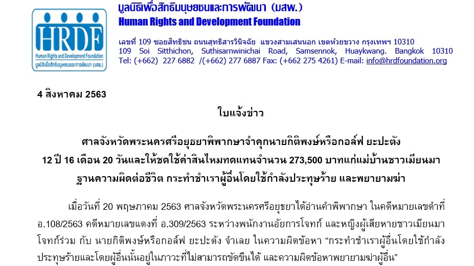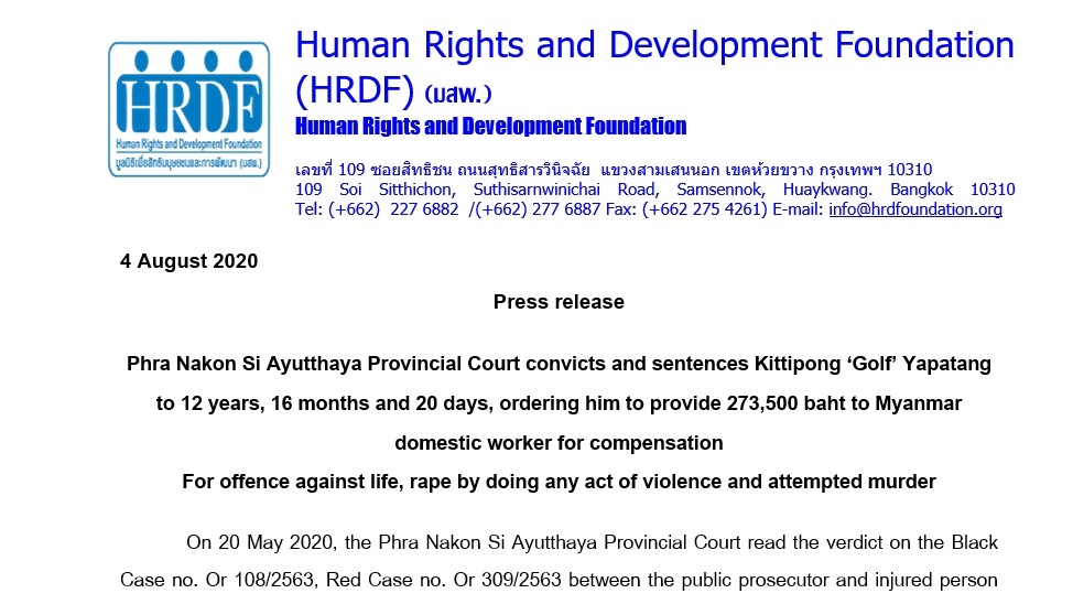 Press release: Phra Nakon Si Ayutthaya Provincial Court convicts and sentences Kittipong ‘Golf’ Yapatang to 12 years, 16 months and 20 days, ordering him to provide 273,500 baht to Myanmar domestic worker for compensation For offence against life, rape by doing any act of violence and attempted murder