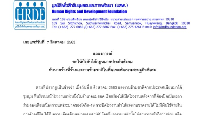 แถลงการณ์: ขอให้บังคับใช้กฎหมายประกันสังคม กับนายจ้างที่จ้างแรงงานข้ามชาติในพื้นเขตพัฒนาเศรษฐกิจพิเศษ