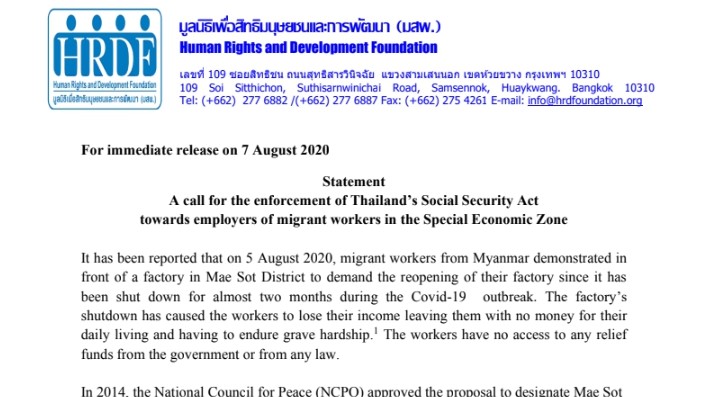 Statement: A call for the enforcement of Thailand’s Social Security Act towards employers of migrant workers in the Special Economic Zone