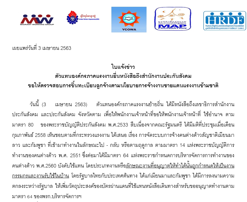 ใบแจ้งข่าว: ตัวแทนองค์กรภาคแรงงานยื่นหนังสือถึงสำนักงานประกันสังคม ขอให้ตรวจสอบการขึ้นทะเบียนลูกจ้างตามนโยบายการจ้างงานชายแดนแรงงานข้ามชาติ