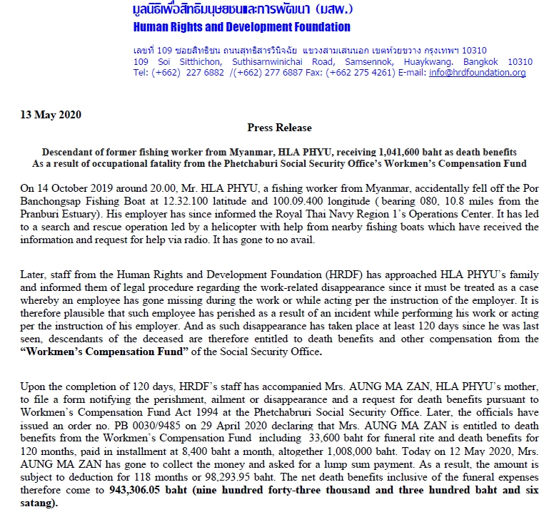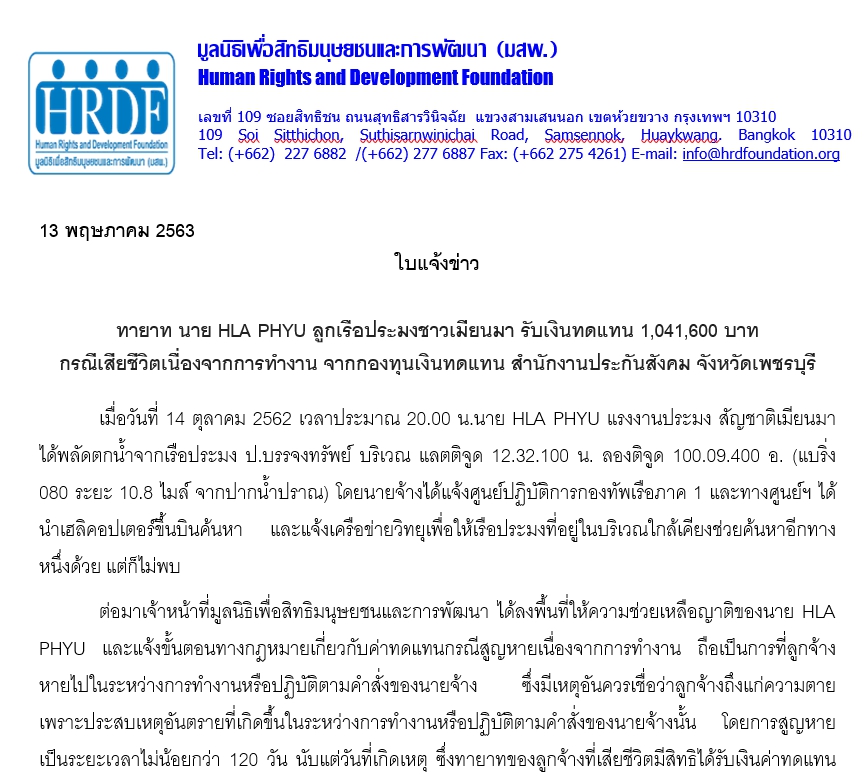 ใบแจ้งข่าว: ทายาท นาย HLA PHYU ลูกเรือประมงชาวเมียนมา รับเงินทดแทน 1,041,600 บาท กรณีเสียชีวิตเนื่องจากการทำงาน จากกองทุนเงินทดแทน สำนักงานประกันสังคม จังหวัดเพชรบุรี