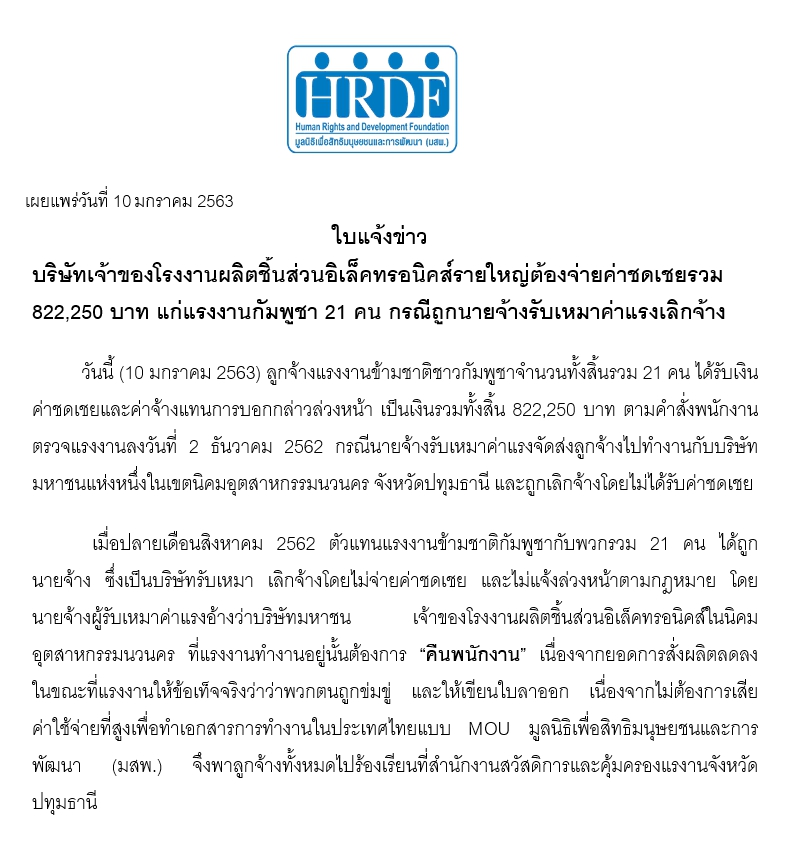 ใบแจ้งข่าว: บริษัทเจ้าของโรงงานผลิตชิ้นส่วนอิเล็คทรอนิคส์รายใหญ่ต้องจ่ายค่าชดเชยรวม 822,250 บาท แก่แรงงานกัมพูชา 21 คน กรณีถูกนายจ้างรับเหมาค่าแรงเลิกจ้าง