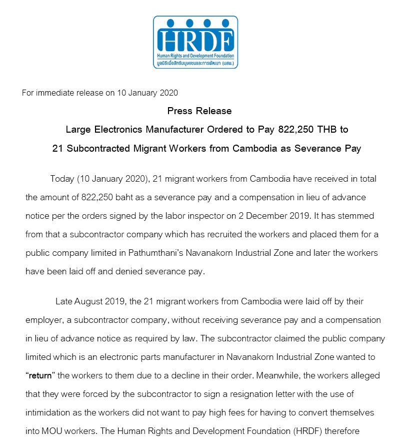 Press Release: Large Electronics Manufacturer Ordered to Pay 822,250 THB to 21 Subcontracted Migrant Workers from Cambodia as Severance Pay