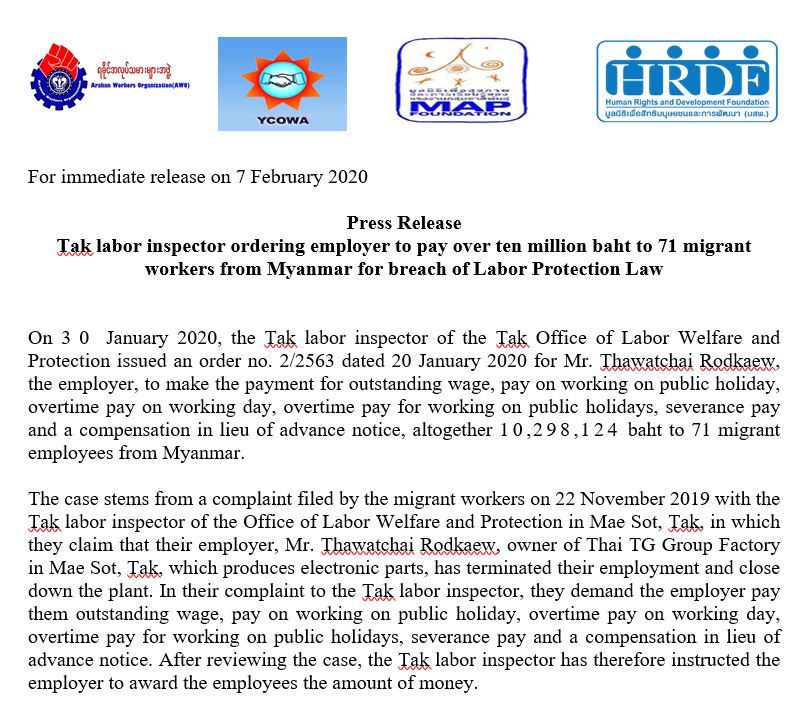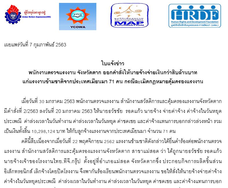 Press Release: Tak labor inspector ordering employer to pay over ten million baht to 71 migrant workers from Myanmar for breach of Labor Protection Law