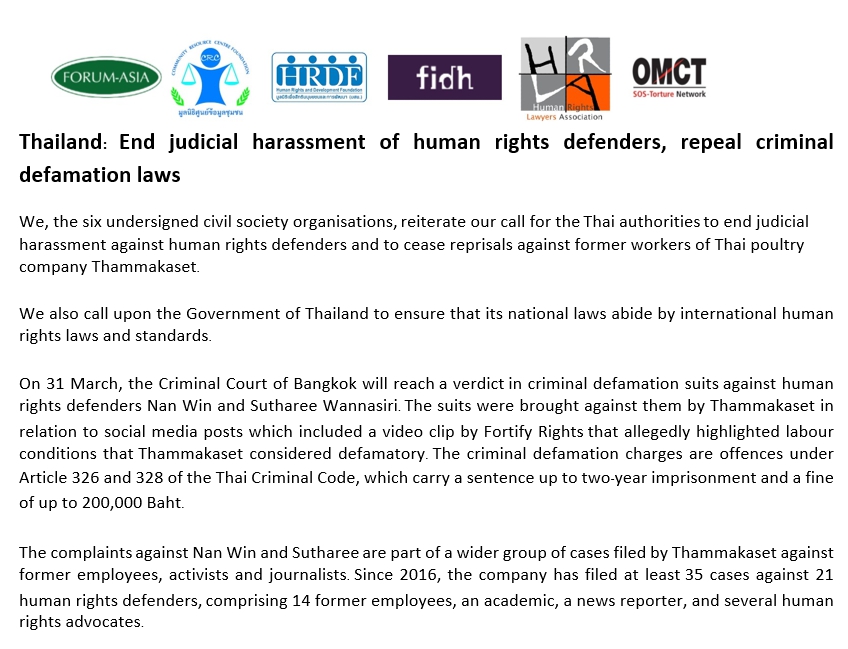 Thailand: End judicial harassment of human rights defenders, repeal criminal defamation laws