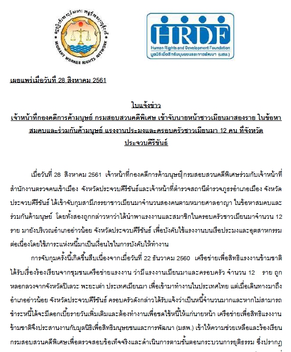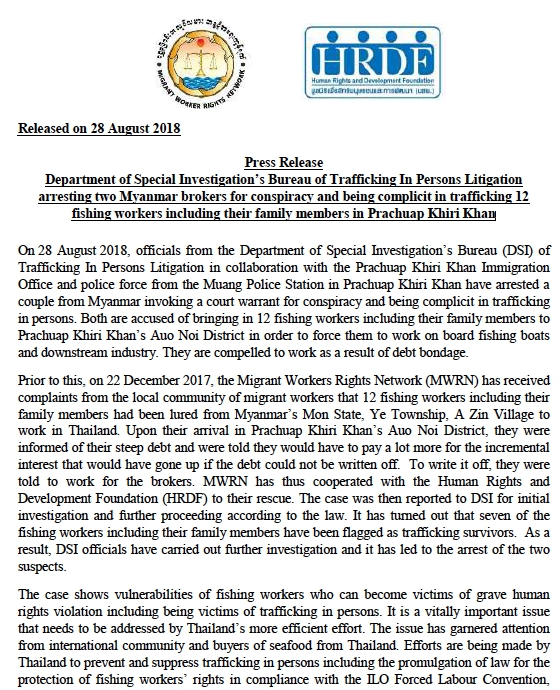 Press Release: Department of Special Investigation’s Bureau of Trafficking In Persons Litigation arresting two Myanmar brokers for conspiracy and being complicit in trafficking 12 fishing workers including their family members in Prachuap Khiri Khan