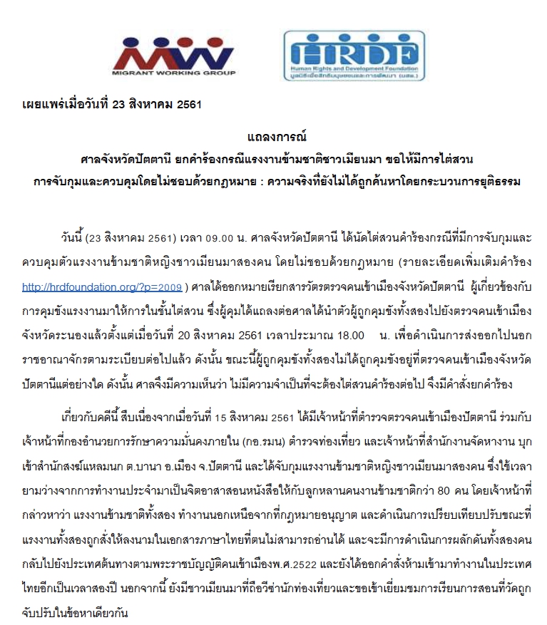 แถลงการณ์: ศาลจังหวัดปัตตานียกคำร้องกรณีแรงงานข้ามชาติชาวเมียนมา ขอให้มีการไต่สวน การจับกุมและควบคุมโดยไม่ชอบด้วยกฎหมาย : ความจริงที่ยังไม่ได้ถูกค้นหาโดยกระบวนการยุติธรรม