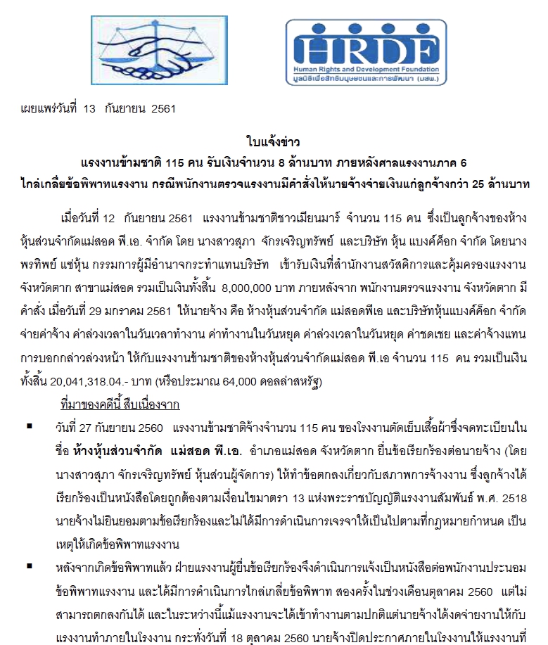 Press Release: 115 migrant workers receiving 8 million baht as compensation after mediation by the Labor Court Region 6, previously labor inspector ordering employer to pay the employees over 25 million baht