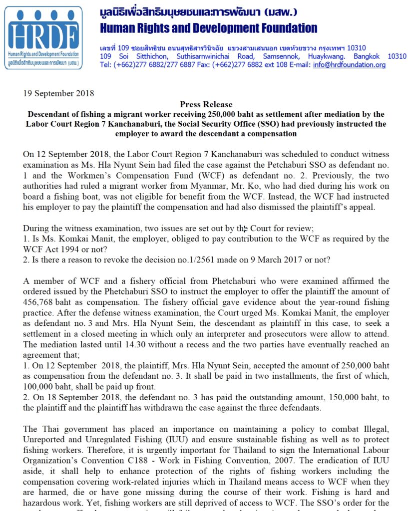 Press Release: Descendant of fishing a migrant worker receiving 250,000 baht as settlement after mediation by the Labor Court Region 7 Kanchanaburi, the Social Security Office (SSO) had previously instructed the employer to award the descendant a compensation