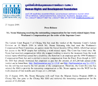 Press Release : Ms. Noom Maisaeng receiving the outstanding compensation for her work-related injury from Workmen’s Compensation per the order of the Supreme Court