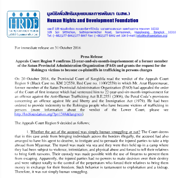 Press Release : Court to deliver verdict on trafficking of Rohingya case On 31 August 2016 at the Provincial Court of Pak Phanang, Nakhon Si Thammarat