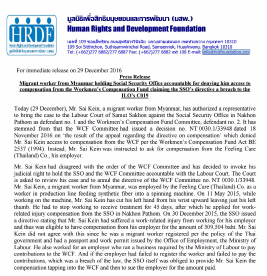 ใบแจ้งข่าว : แรงงานข้ามชาติสัญชาติพม่ายื่นฟ้องสำนักงานประกันสังคม กรณีปฏิเสธแรงงานข้ามชาติเข้าถึงเงินทดแทนจากกองทุนเงินทดแทน และคำสั่งสำนักงานประกันสังคมขัดต่ออนุสัญญาไอแอลโอ ฉบับที่ 19