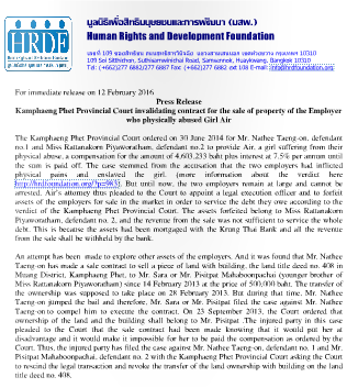 Press Release Kamphaeng Phet Provincial Court invalidating contract for the sale of property of the Employer who physically abused Girl Air
