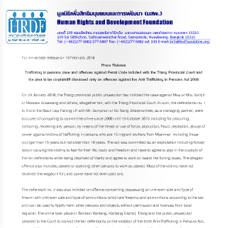 Press Release: Trafficking in persons case and offences against Penal Code indicted with the Trang Provincial Court and the plea to be co-plaintiff dismissed only on offences against the Anti-Trafficking in Persons Act 2008