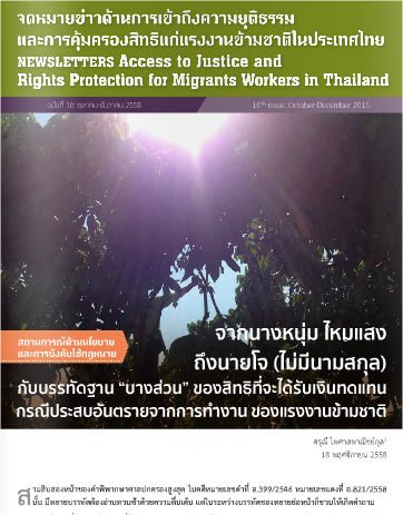 Quarterly Newsletter 10th issue-October-December 2015: Access to Justice and Rights Protection for Migrants Workers in Thailandหนังสือข่าวด้านการเข้าถึงความยุติธรรมและการคุ้มครองสิทธิแก่แรงงานข้ามชาติในประเทศไทย ฉบับ 10 ระหว่างเดือนตุลาคม-ธันวาคม 2558