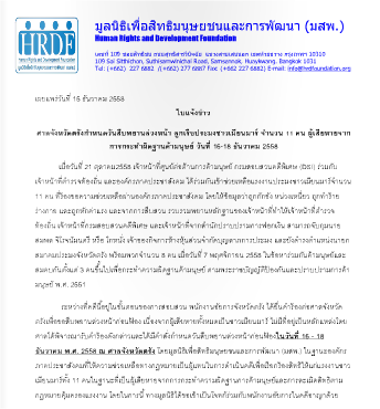 ใบแจ้งข่าว: ศาลจังหวัดตรังกำหนดวันสืบพยานล่วงหน้า ลูกเรือประมงชาวเมียนมาร์ จำนวน 11 คน ผู้เสียหายจากการกระทำผิดฐานค้ามนุษย์ วันที่ 16-18 ธันวาคม 2558
