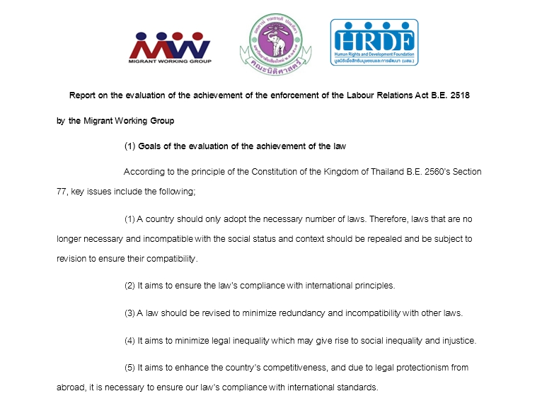 Migrant Working Group (MWG), Faculty of Law, Chiangmai University and HRDF submitted Report on the evaluation of the achievement of the enforcement of the Labour Relations Act B.E. 2518