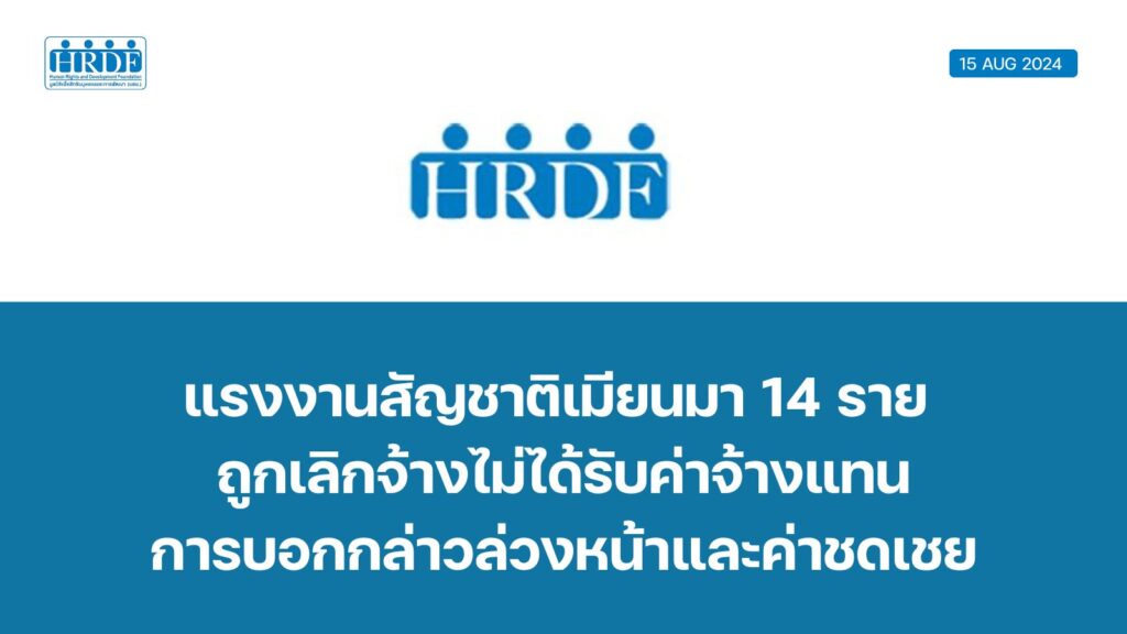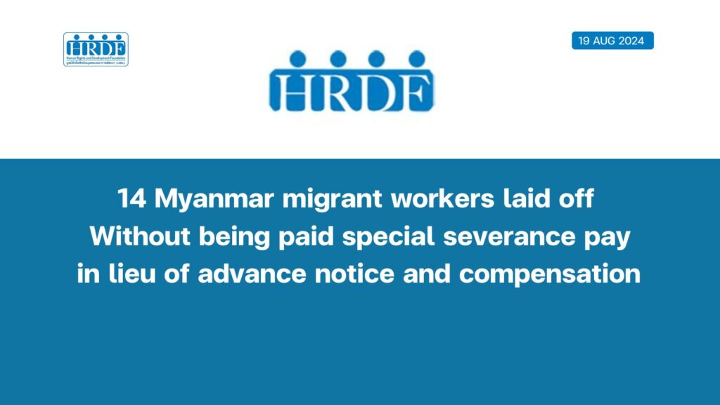 แรงงานสัญชาติเมียนมา 14 ราย ถูกเลิกจ้างไม่ได้รับค่าจ้างแทนการบอกกล่าวล่วงหน้าและค่าชดเชย