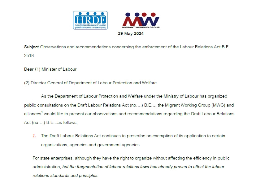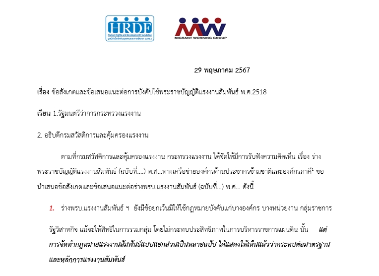 เครือข่ายองค์กรแรงงานด้านประชากรข้ามชาติและมูลนิธิเพื่อสิทธิมนุษยชนและการพัฒนา ยื่นข้อเสนอ ในเวทีรับฟังความคิดเห็น ร่างพระราชบัญญัติแรงงานสัมพันธ์ (ฉบับที่…) พ.ศ…. จัดโดยกระทรวงแรงงาน เมื่อวันที่ 29 พฤษภาคม 2567