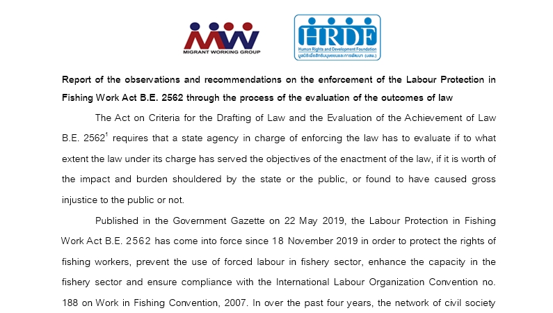 Migrant Working Group (MWG) and HRDF submitted Report of the observations and recommendations on the enforcement of the Labour Protection in Fishing Work Act B.E. 2562 through the process of the evaluation of the outcomes of law